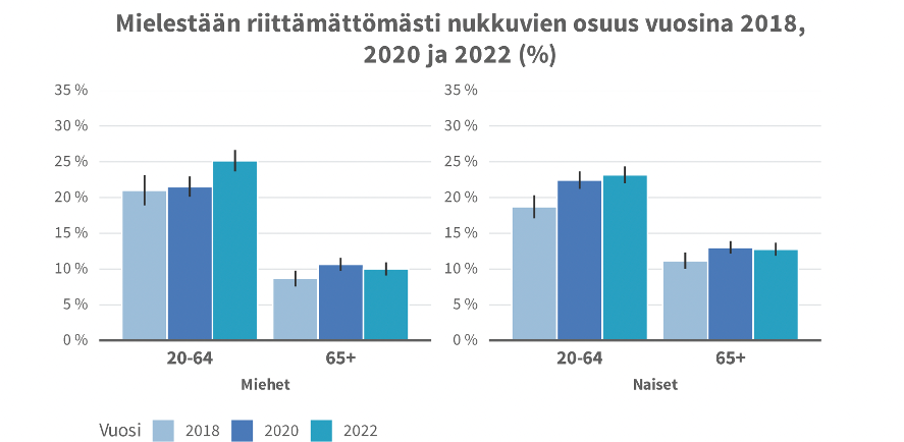 Tilanne on yleisesti haastava, koska 20–64-vuotiaiden riittämättömästi nukkuvien osuus on kasvanut naisten ja miesten osalta vuodesta 2018 vuoteen 2022. Erityisesti vuonna 2022 on näkyvä nousu tilastoissa.
